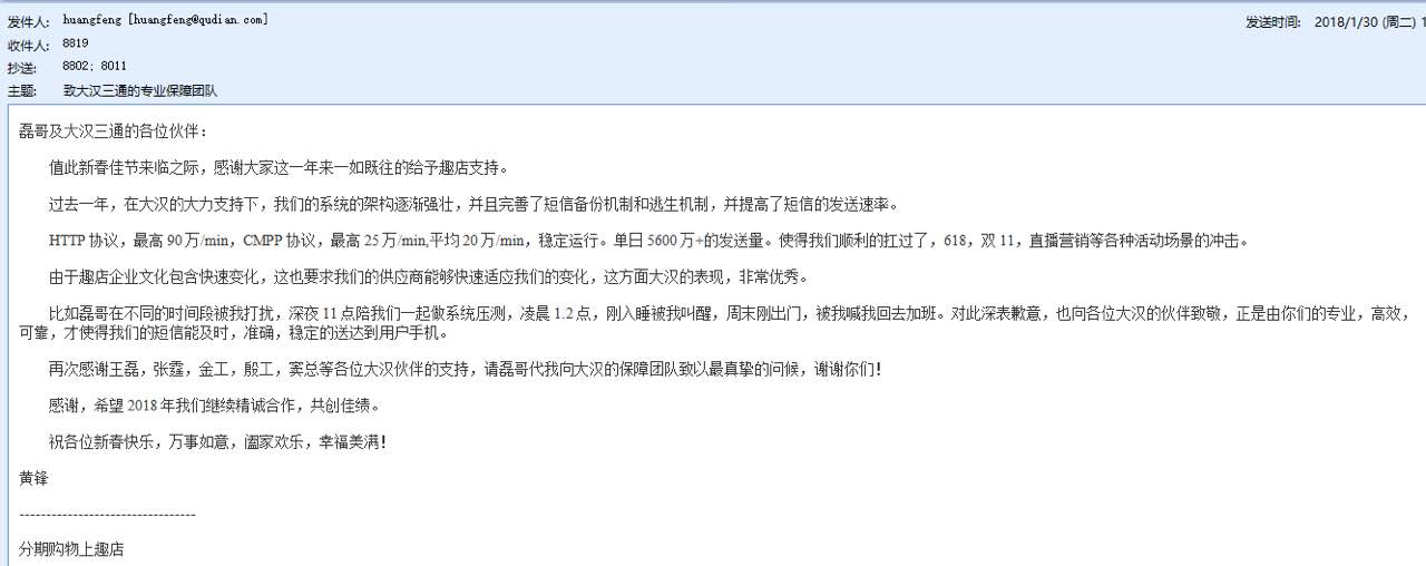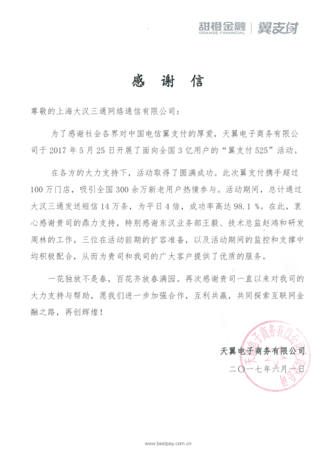 中國(guó)電信翼支付于2017年5月25日開(kāi)展了面向全國(guó)的"翼支付525活動(dòng)"?;顒?dòng)期間,大漢三通發(fā)送短信14萬(wàn)條,為平日4倍,成功率高達(dá)98.1%